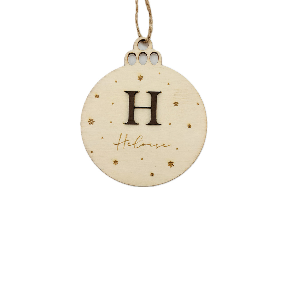Apportez une touche unique et élégante à votre sapin avec notre boule de Noël en bois ronde, personnalisée avec le prénom de votre choix et la première lettre en relief.
