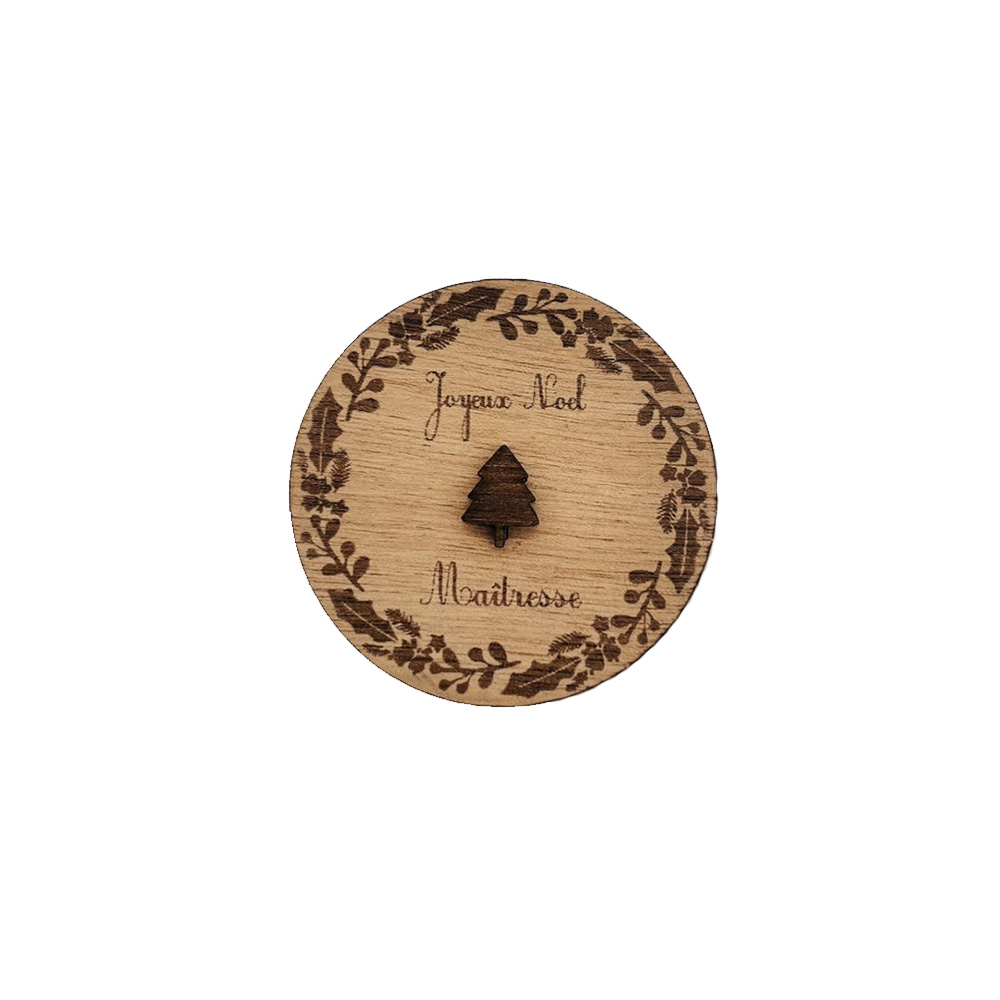 Ce magnet rond en bois naturel (diamètre 5 cm) est décoré d’un sapin en relief au centre et entouré d’une jolie couronne de fleurs de Noël finement gravée. L’inscription “Joyeux Noël [Maîtresse / Maître / Nounou / ATSEM]” apporte une touche personnalisée et festive à ce cadeau unique.