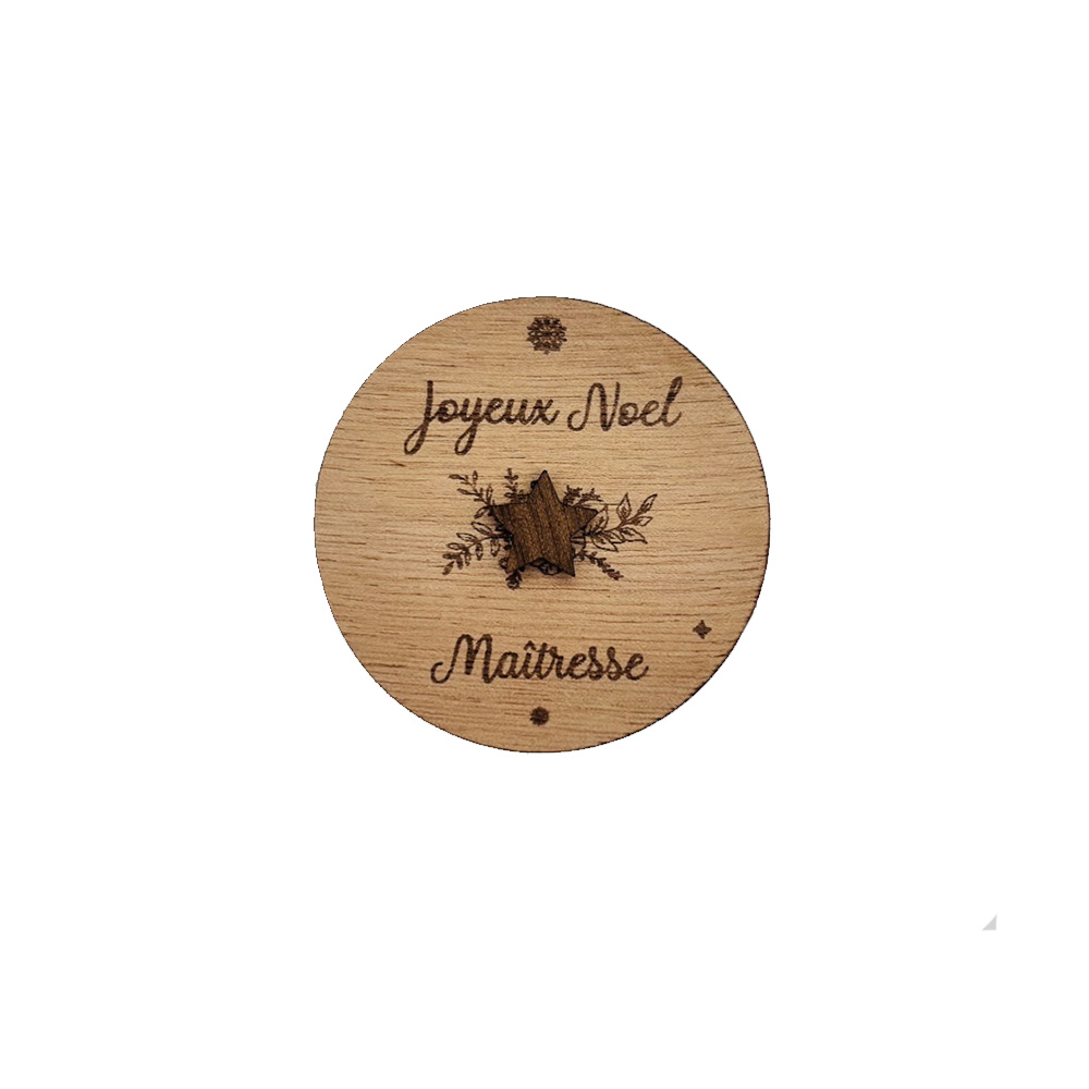 Ce magnet rond en bois naturel (5 cm de diamètre) est orné d’une étoile en relief au centre, délicatement mise en valeur par un fond de fleurs de Noël gravées. L’inscription “Joyeux Noël [Maîtresse / Maître / Nounou / ATSEM]” vient compléter l’ensemble avec une touche douce et festive.