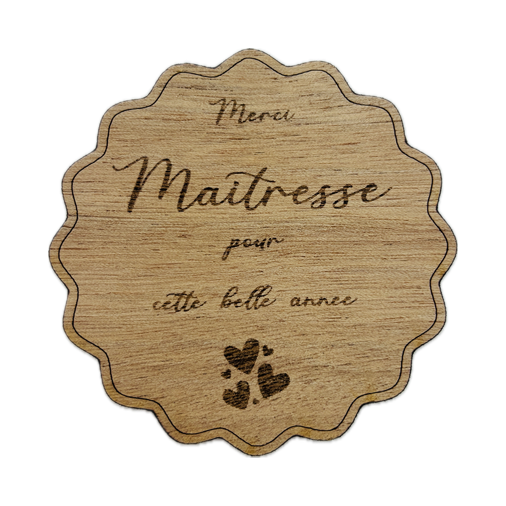 Offrez un petit cadeau plein de tendresse pour remercier celles et ceux qui ont accompagné votre enfant tout au long de l’année scolaire ! Ce joli magnet en bois de 7 cm x 7 cm est une attention simple, touchante et durable, à offrir à la maîtresse, au maître, à l’ATSEM ou à la nounou.