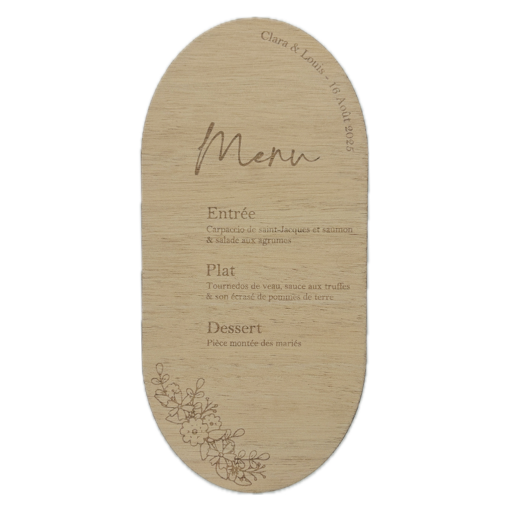 Sublimez vos tables avec ce menu en bois personnalisé, conçu pour être placé directement sur l’assiette de vos invités. Élégant et raffiné, il met en valeur votre menu tout en apportant une touche authentique et naturelle à votre décoration. Sa gravure sur mesure permet d’y inscrire votre sélection de plats, les prénoms des mariés ou le logo de votre événement. Parfait pour les mariages, les dîners d’exception et les événements professionnels, ce menu en bois constitue un souvenir unique pour vos convives.