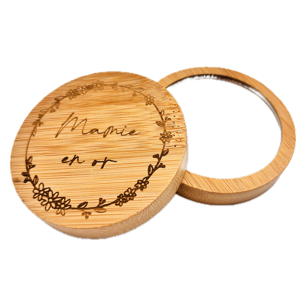 Parce que chaque grand-mère mérite d’être chérie, ce miroir de poche en bois est le cadeau parfait pour lui dire combien elle compte. Gravé de l’inscription "Mamie en or", entourée d’une délicate couronne de fleurs, il allie tendresse et élégance naturelle.