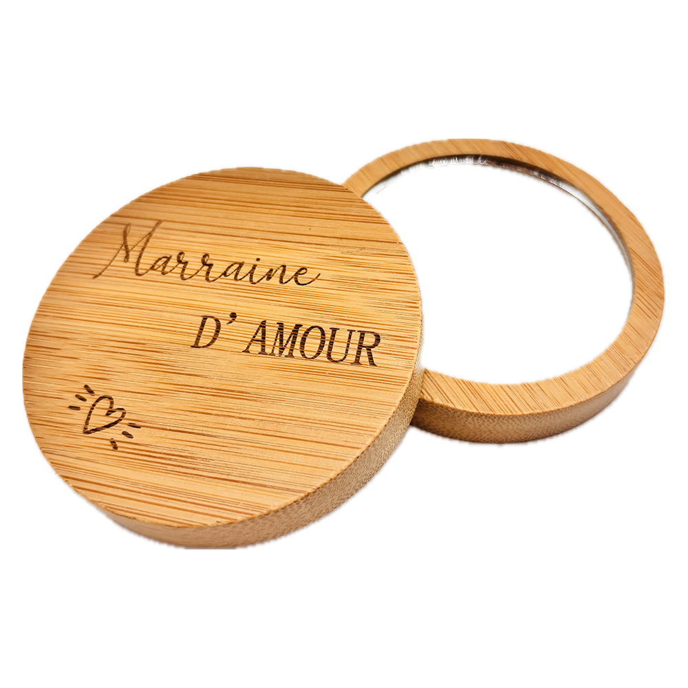 Un petit mot doux pour une grande personne ! Ce miroir de poche en bois est une délicate attention pour une marraine exceptionnelle. Gravé de l’inscription "Marraine d’amour" et décoré de petits cœurs en dessin, il est à la fois tendre, élégant et symbolique.