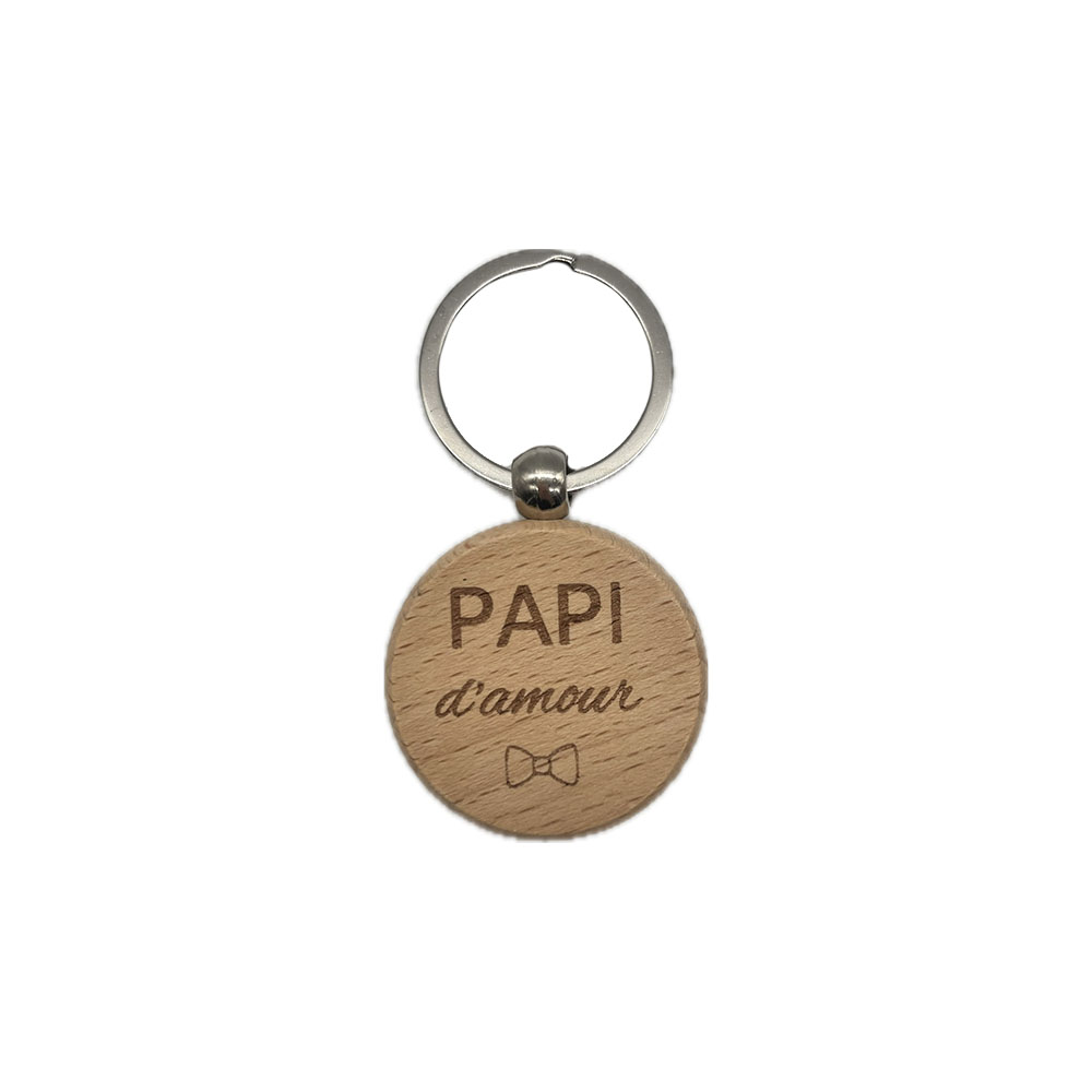 Ce porte-clés en bois est gravé de l’inscription « Papi d’amour » et décoré d’un joli nœud papillon, symbole d’élégance et d’affection.