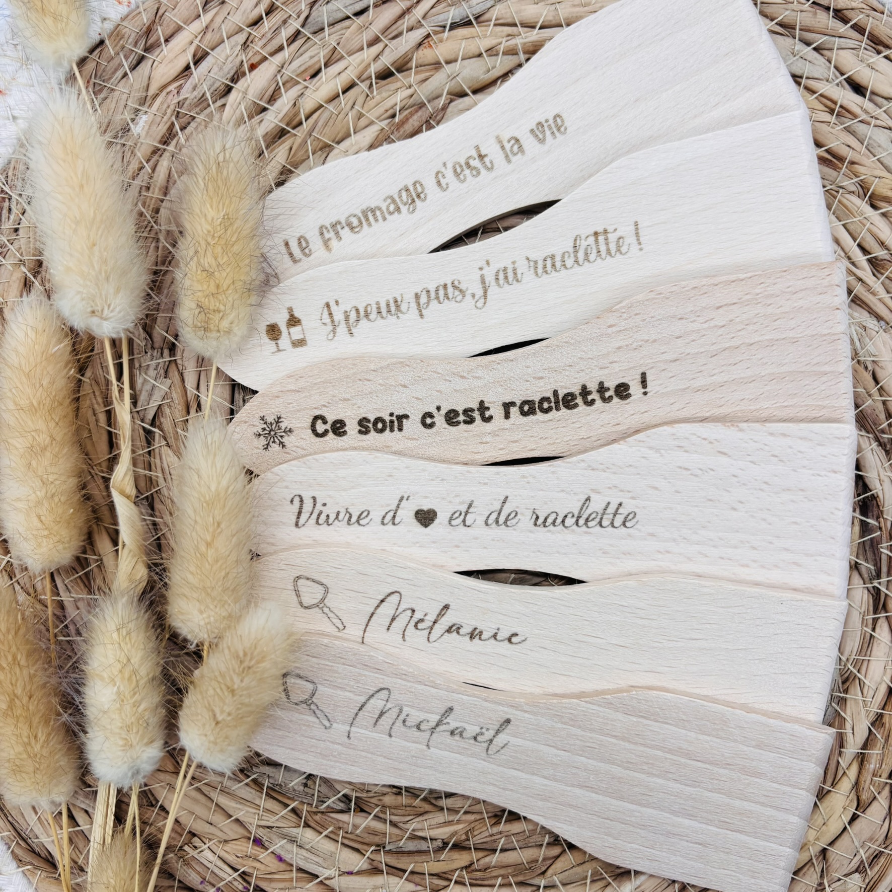 Rendez vos soirées raclette encore plus conviviales et amusantes avec cette spatule à raclette en bois personnalisée. Que ce soit avec un prénom ou une phrase originale, cette spatule unique ajoute une touche personnelle et ludique à vos moments gourmands.
