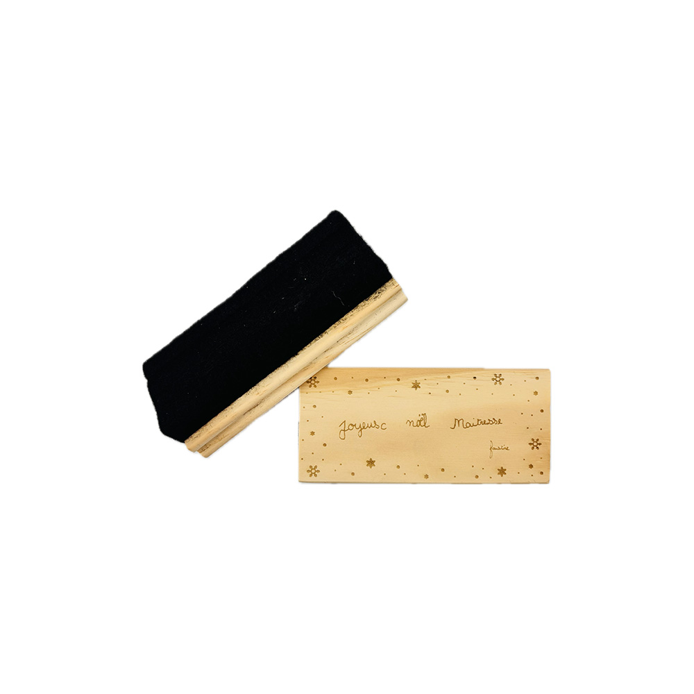 Ce tampon effaceur en bois est bien plus qu’un simple cadeau : c’est une création personnalisée à partir de l’écriture de votre enfant. Il porte la mention “Joyeux Noël Maîtresse/Maître”, signée du prénom de l’enfant, reproduit fidèlement pour un résultat attendrissant et authentique.