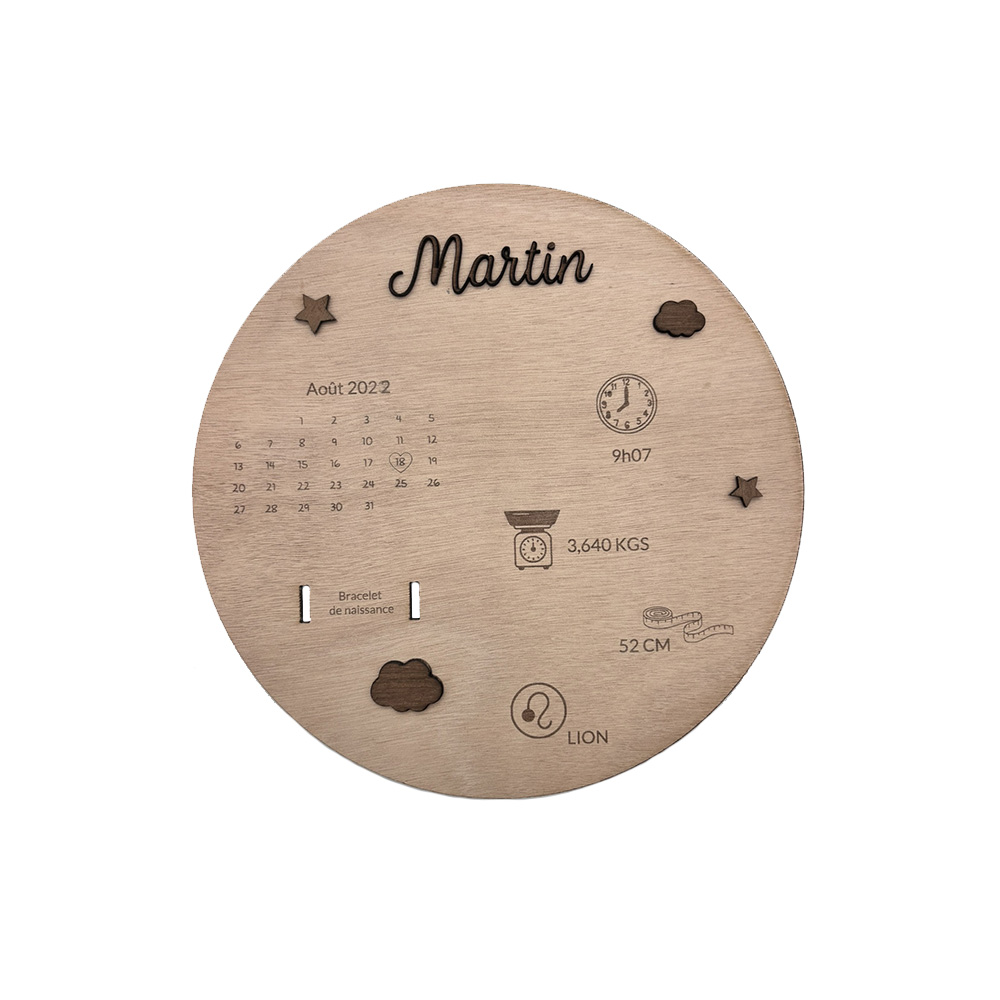 Réalisé avec soin dans notre atelier, ce panneau de 26 cm de diamètre est gravé avec les informations de naissance de votre enfant :