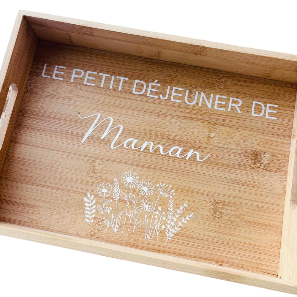 Offrez un moment de douceur avec ce joli plateau en bois personnalisé, idéal pour servir le petit déjeuner avec amour. Élégant et naturel, il est décoré de l’inscription « Le petit déjeuner de Maman » accompagnée d’un délicat motif floral qui apporte une touche poétique et raffinée.