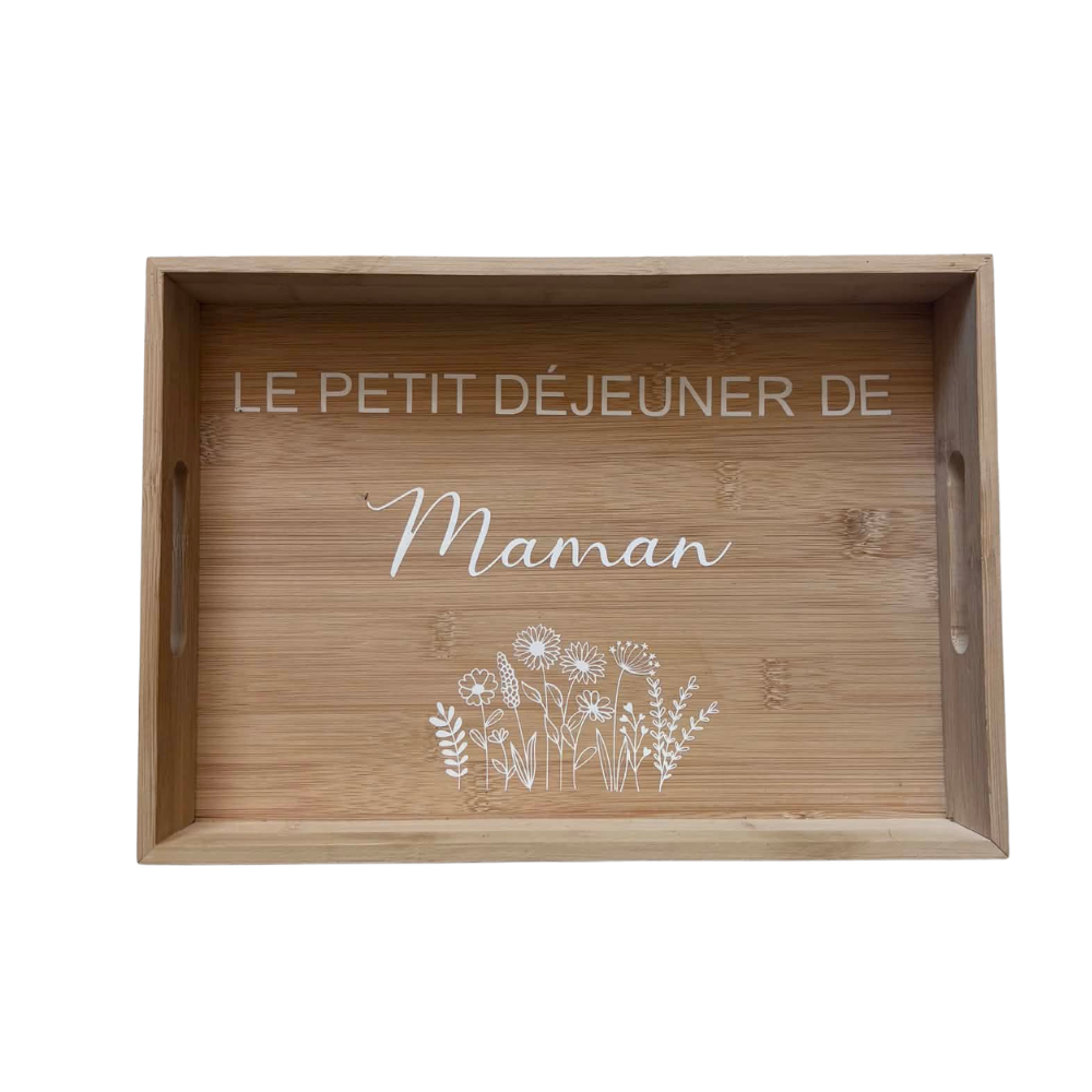 Offrez un moment de douceur avec ce joli plateau en bois personnalisé, idéal pour servir le petit déjeuner avec amour. Élégant et naturel, il est décoré de l’inscription « Le petit déjeuner de Maman » accompagnée d’un délicat motif floral qui apporte une touche poétique et raffinée.